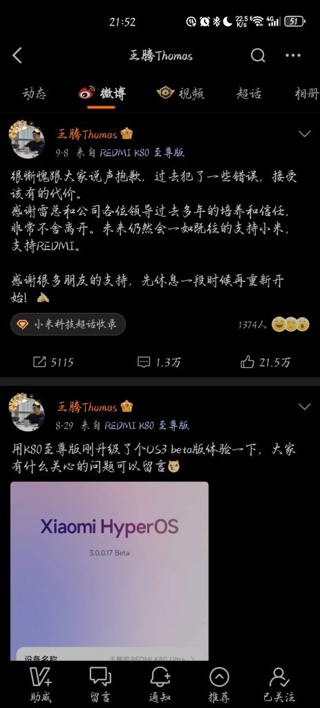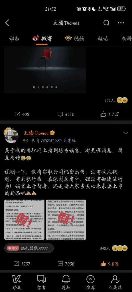根据小米集团职业道德委员会2025年9月8日发布的内部邮件,王腾因“泄露公司机密信息,且存在利益冲突等严重违规违纪行为”被辞退。随后,王腾本人在微博上回应称:“过去犯了一些错误,接受该有的代价”,并否认了“出售机密”或“收钱”等传言,表示“有失职行为,在深刻反省中,但没有做违法行为”。